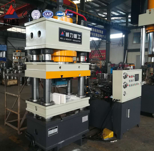 山東威力重工生產的250噸四梁四柱液壓機|粉末壓制成型機主要是模壓成形是將松散的粉末裝入模具內受壓成形。模壓成形一般在普通的機械壓力機或液壓機上進行,常用壓力機的噸位為500~5000 kN。實際生產中可通過提高模具內壁光潔度來降低模具高徑比,采用雙向壓制等方法來改善壓坯密度不均勻。